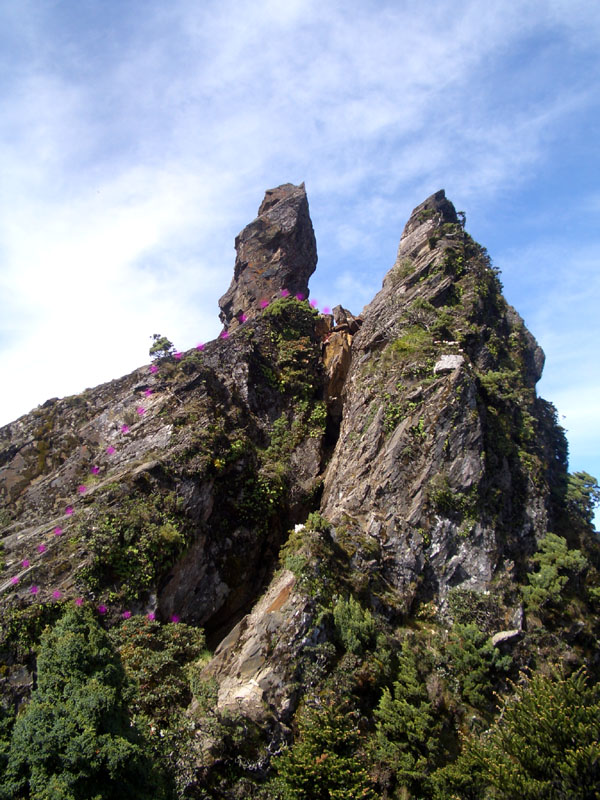 由北往南望恐龍塔(左), 粉紅點為上攀恐龍塔的路線.